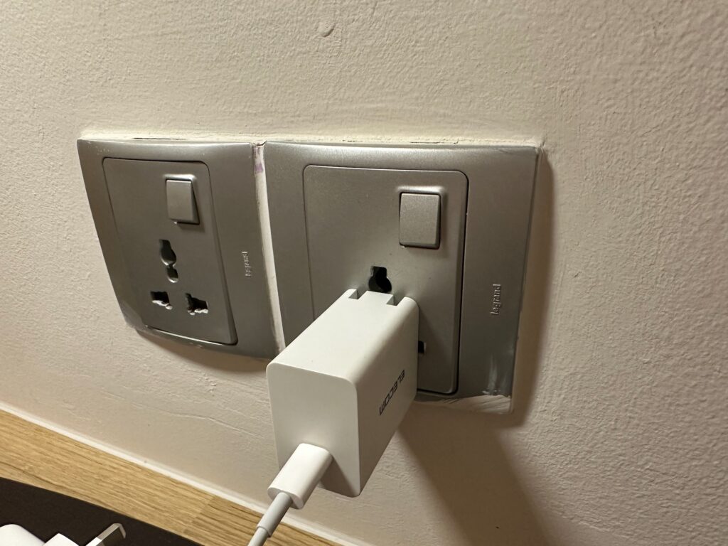 ただ、結果論で言えば、シンガポールのホテルや空港で使ったコンセントは複数の形状に対応しているものが多く、変換アダプターは必要なかった。以下の写真左は変換アダプターを使った状態で、右は直接挿したところ。