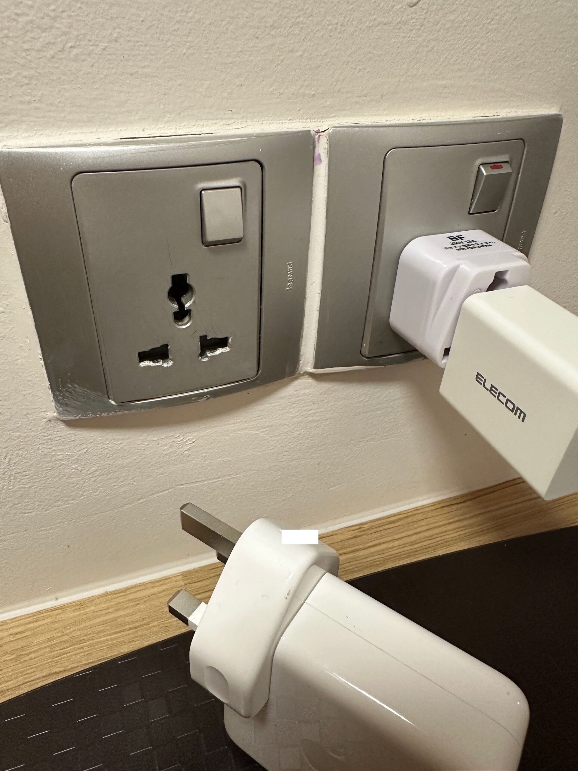 ただ、結果論で言えば、シンガポールのホテルや空港で使ったコンセントは複数の形状に対応しているものが多く、変換アダプターは必要なかった。以下の写真左は変換アダプターを使った状態で、右は直接挿したところ。