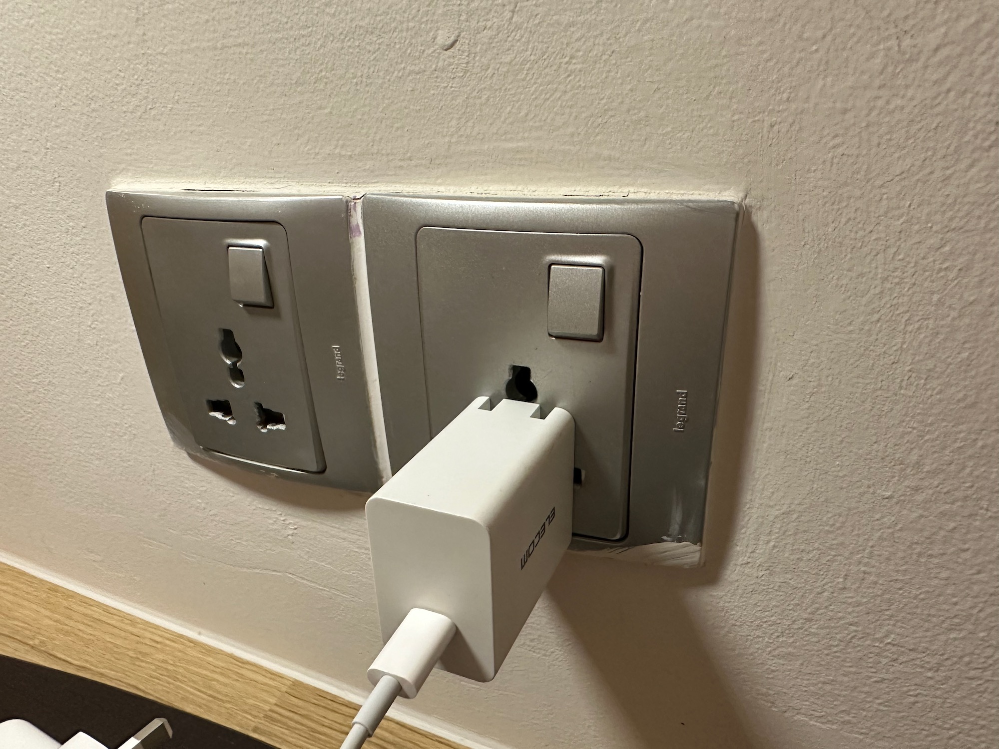 MacBookのACアダプターと、ELECOMのUSB-C ACアダプターを持って行った。コンセントの形状の違いについては、変換アダプターを合計2個買って持っていった。
